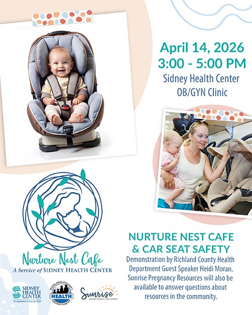 Sidney Health Center is holding a Nurture Nest Café on Tuesday, April 14 from 3:00 PM - 5:00 PM in the Sidney Health Center OB/GYN Clinic Waiting Room located at 214 14th Ave SW.